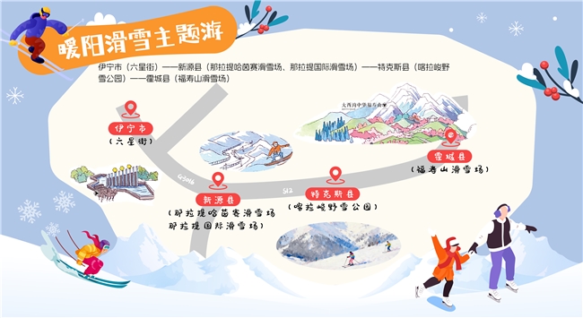 暖阳滑雪主题游:串联伊宁市六星街、新源县那拉提滑雪场、特克斯喀拉峻野雪公园、霍城福寿山滑雪场。